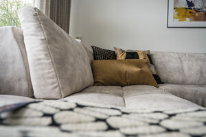 In dit appartement hebben we gebruik gemaakt van lichte aardetinten. Door het gebruik van bewerkte materialen wordt de ruimte al snel gezellig. Dit zie je onder andere terug in de bank, de fauteuil, het vloerkleed en het behang. Door deze prachtige basis is het gemakkelijk om hier een persoonlijke touch aan toe te voegen. En dat is met de gouden accessoires zeker gelukt!